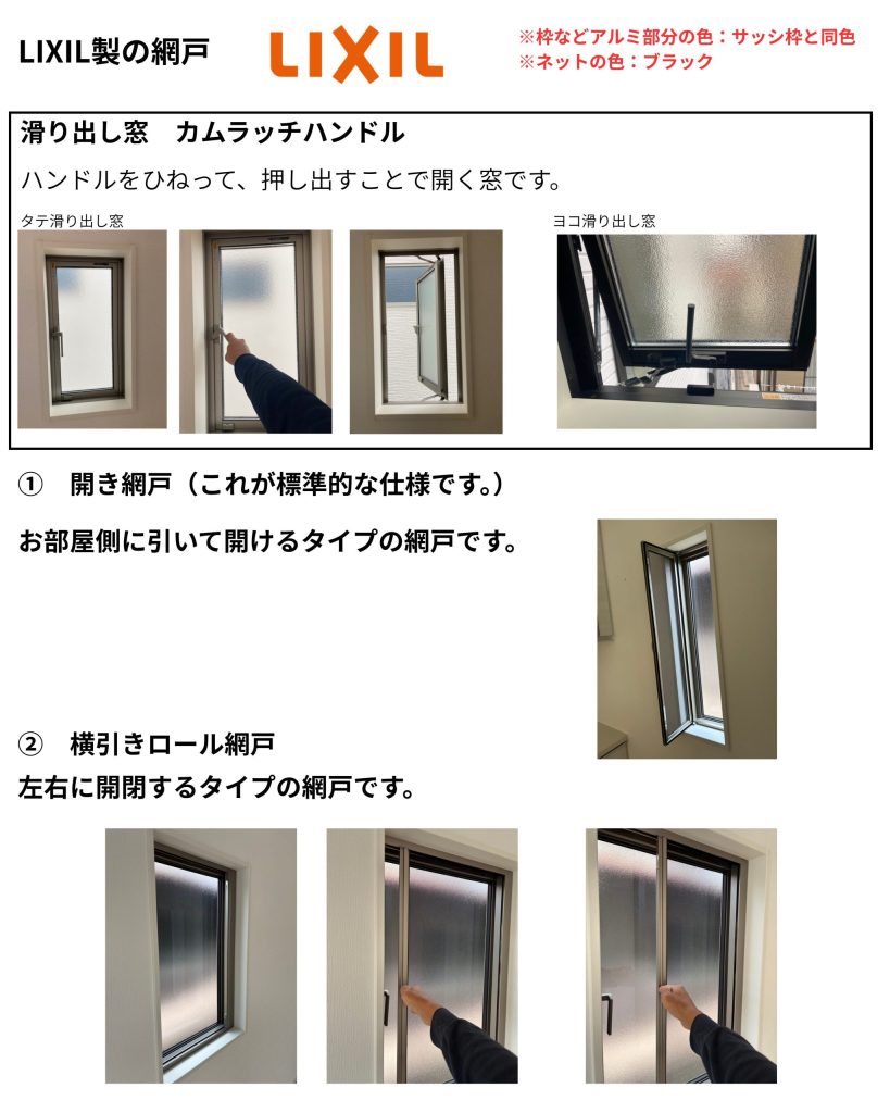 結論、「”カムラッチハンドルタイプの滑り出し窓”に取付する網戸の仕様」がご希望に合うかで選択することをおすすめします。