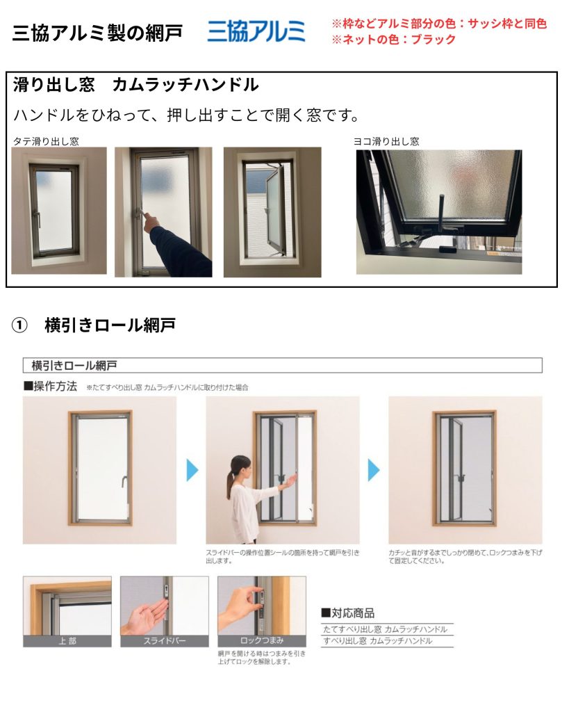 ④カムラッチハンドルタイプの滑り出し窓に取付する網戸は各メーカー、仕様が異なります。